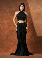 This black drape set features hand embroidered sequins over lycra halter neck blouse paired with a bold thigh- high slit skirt with gathered drape