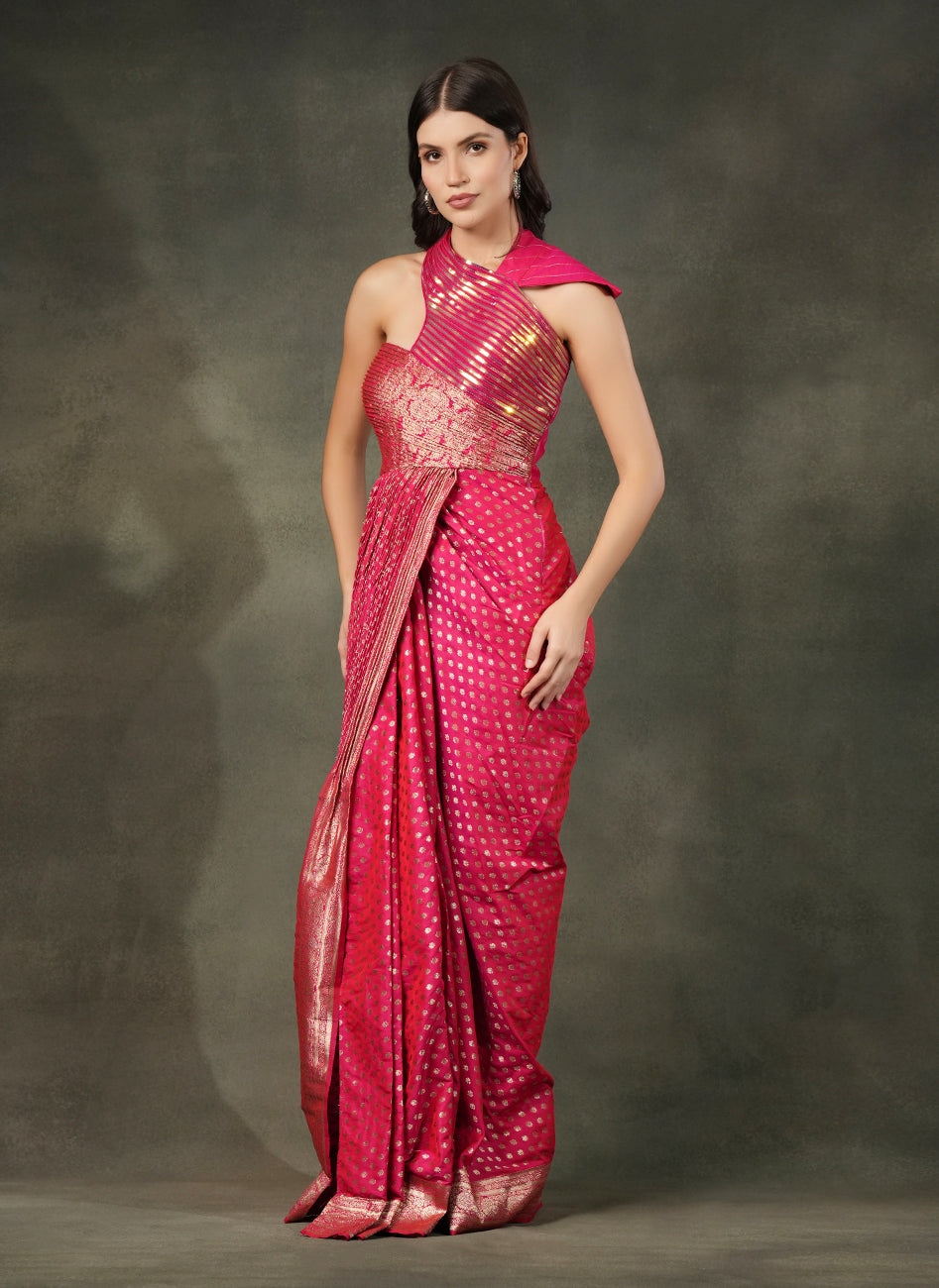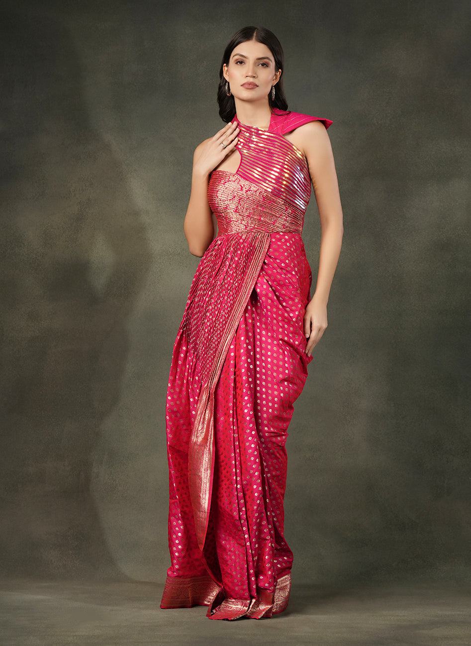 This striking Rani Pink pre draped dress crafted in rich woven Banarsi silk with gold motifs featuring a thigh-high slit, paired with one shoulder blouse which is sculpted with detailing and pleats