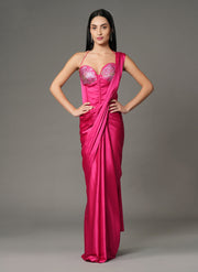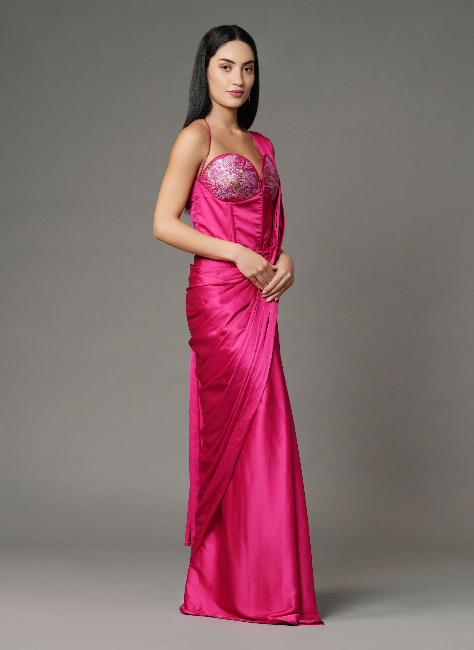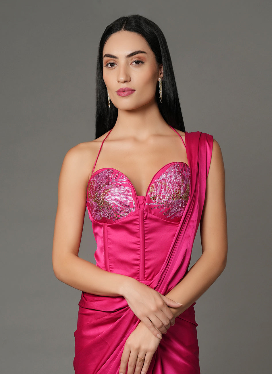 This bright Pink pre-drape saree is crafted in soft satin sculpted corset blouse featuring detailed glitter work and halter neck that gives effortlessly grace.