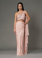 This 2 piece set features sequin detailed blouse with tassels and a skirt that gives effortlessly grace draped saree effect to it.