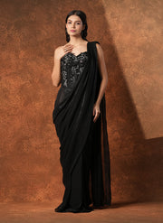 This metallic silver hand embroidered corset blouse with tonal floral embellishments and beadwork with pre-stitched drape in fluid shimmer georgette