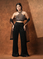 This set features a hand embroidered halter neck blouse with multi tonal sequins and beads featuring a sculpted neckline, paired with a high-waisted sequin embroidered fabric straight-cut trousers and a sheer black net dupatta.