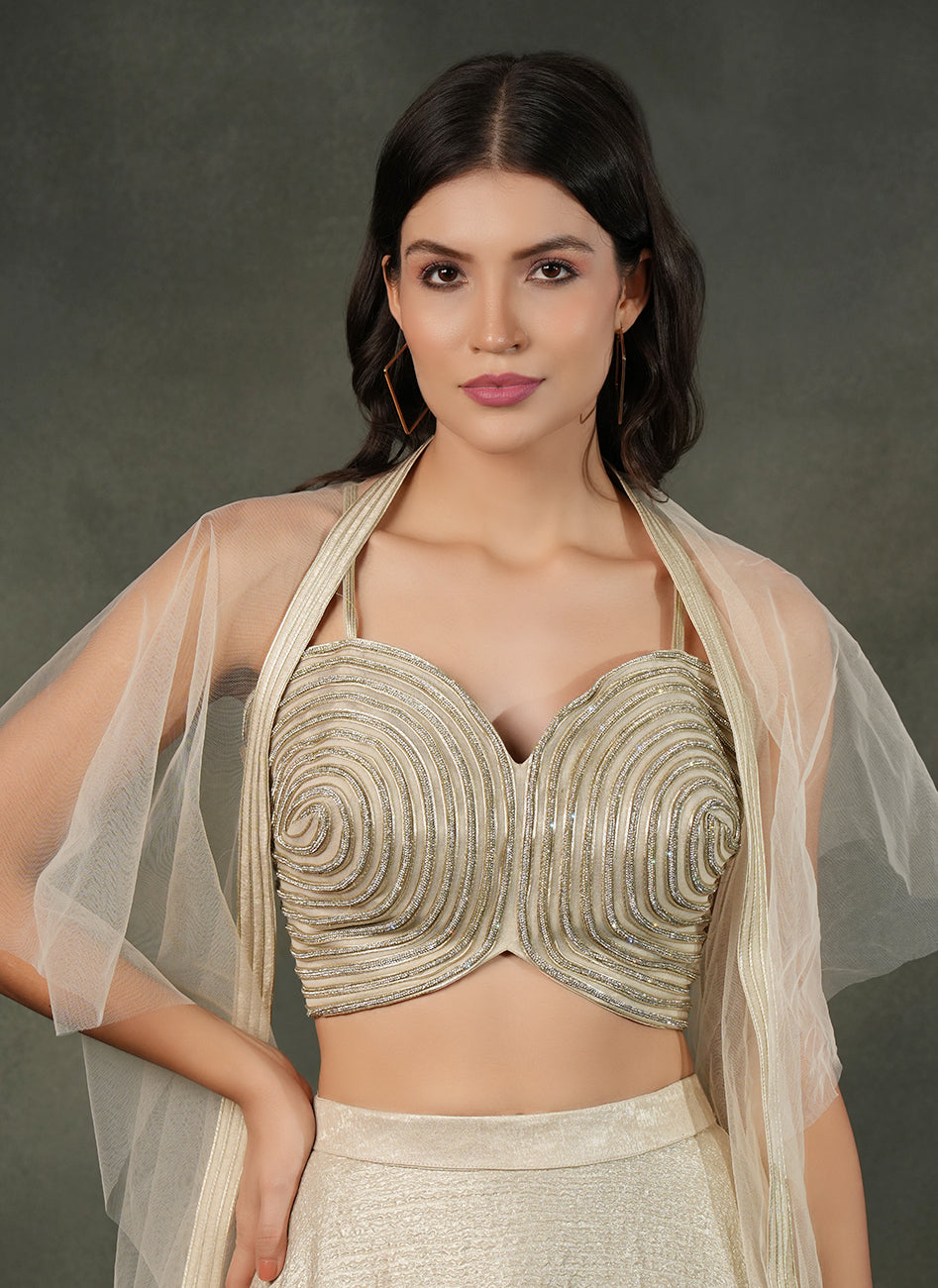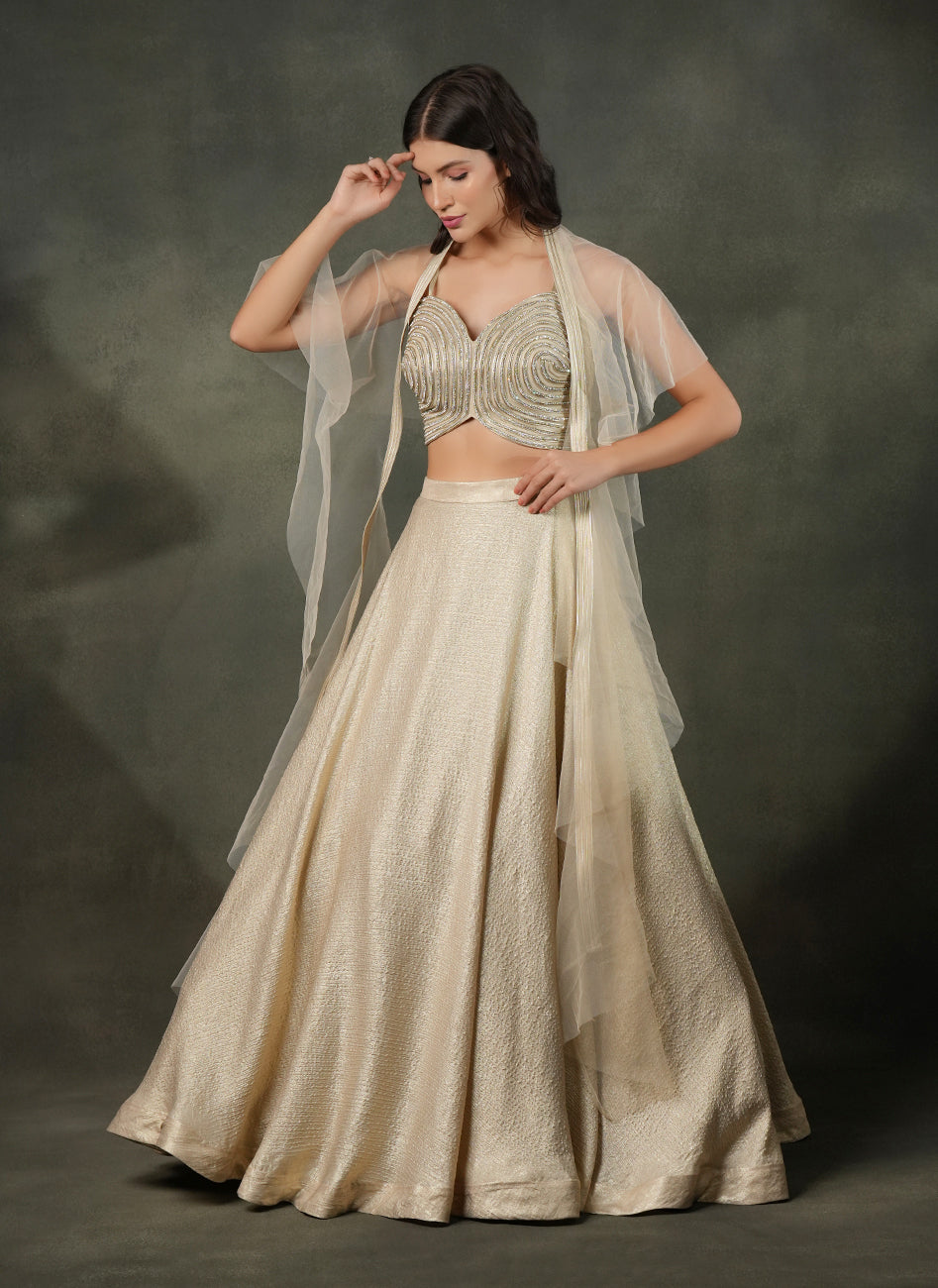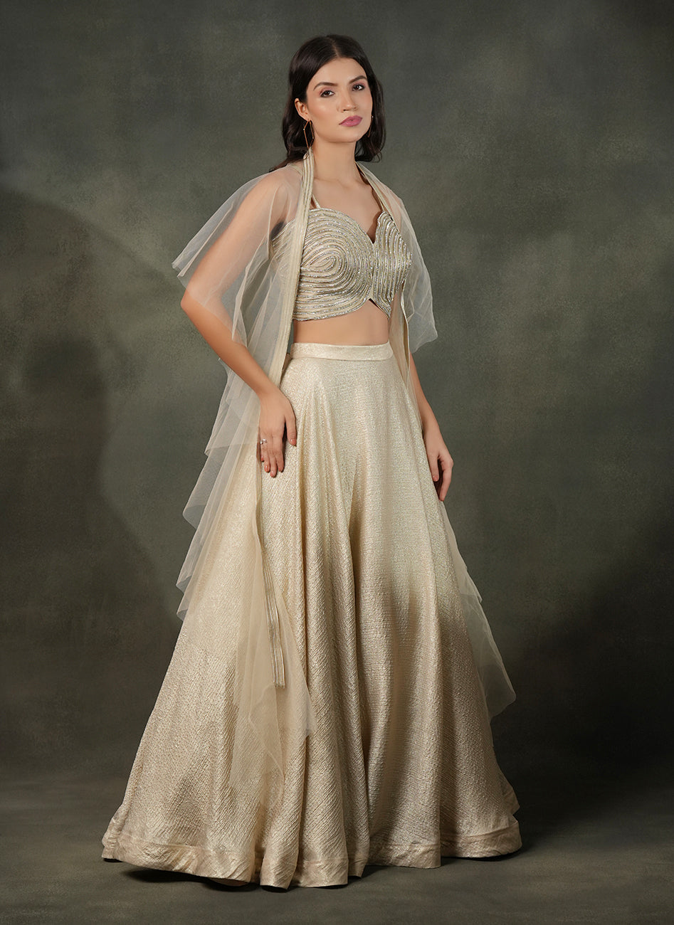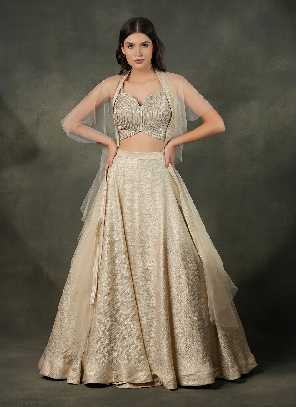 This stunning Sunset gold lehnga set is crafted in luxurious gold crush satin paired with a statement blouse featuring exquisite hand embroidery with shimmery stones.The sheer mesh cape adds a contemporary twist to this set