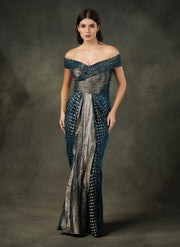 This banarsi silk off shoulder neckline with ruched crossover detailing, pre-draped gown with regal midnight blue and antique gold motifs, twisted front drape flowing into soft pleats