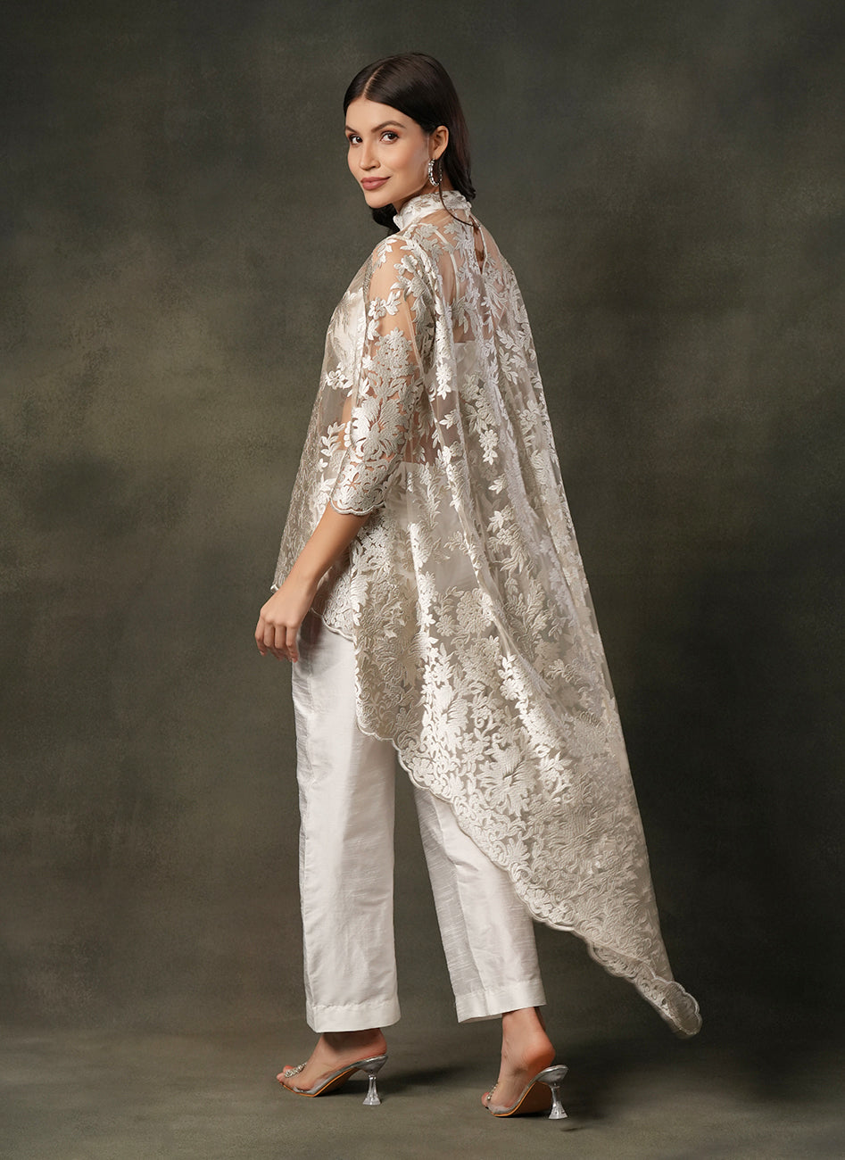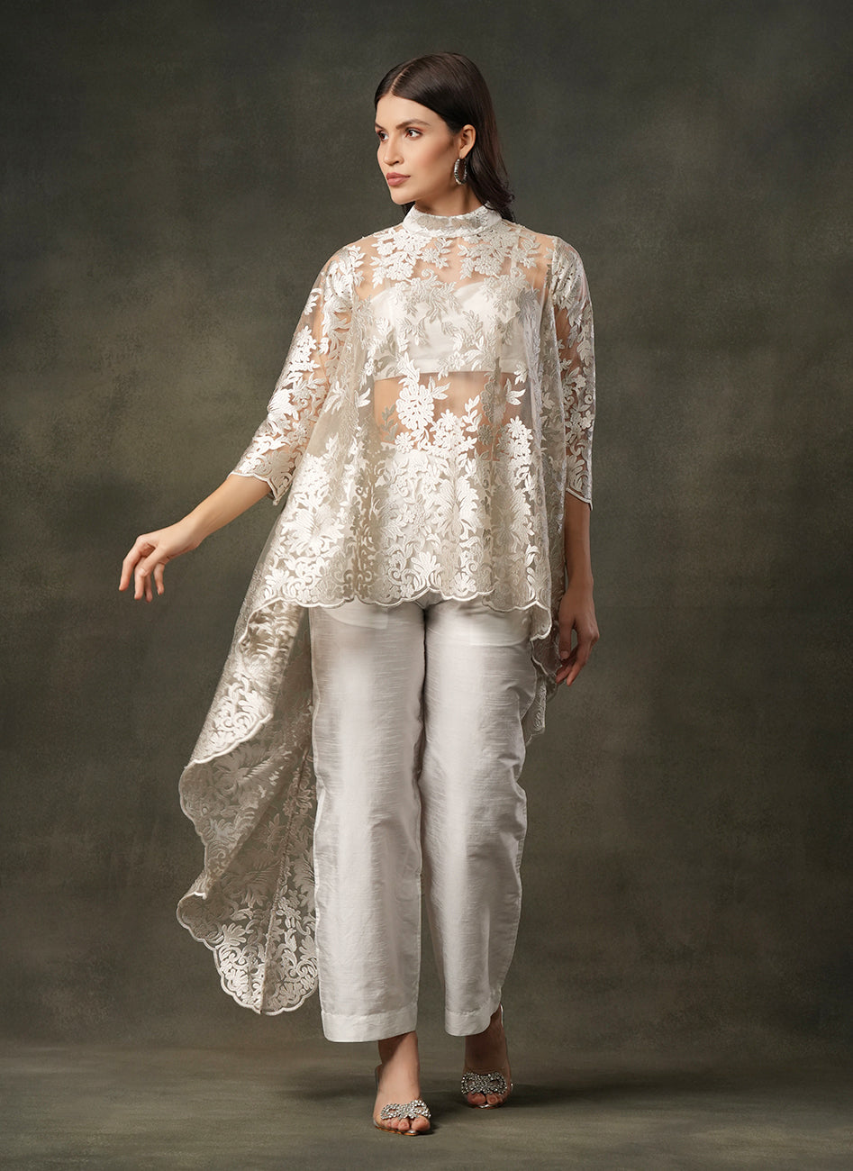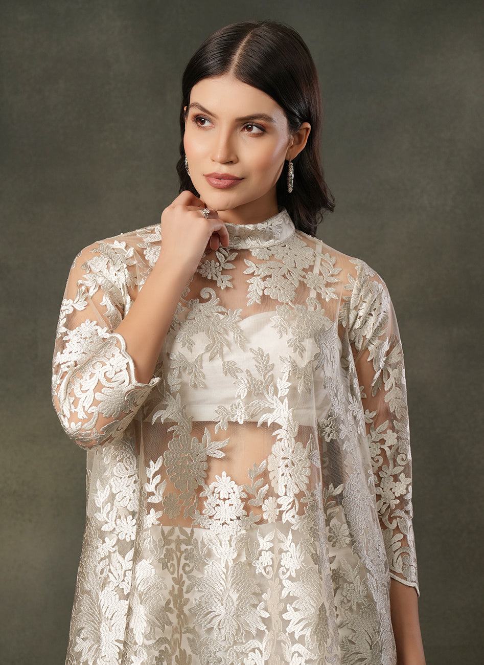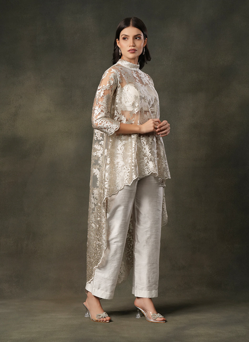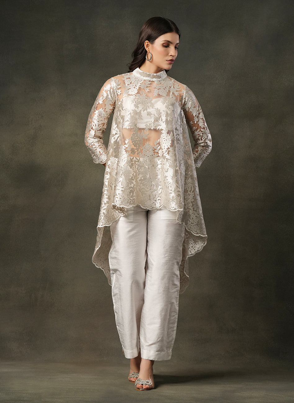 This embroidered fusion set is crafted in sheer floral lace, featuring the high-low tunic with a mandarin collar and full sleeves, paired with straight-fit pants in matching tones and includes a bustier for effortless layering.