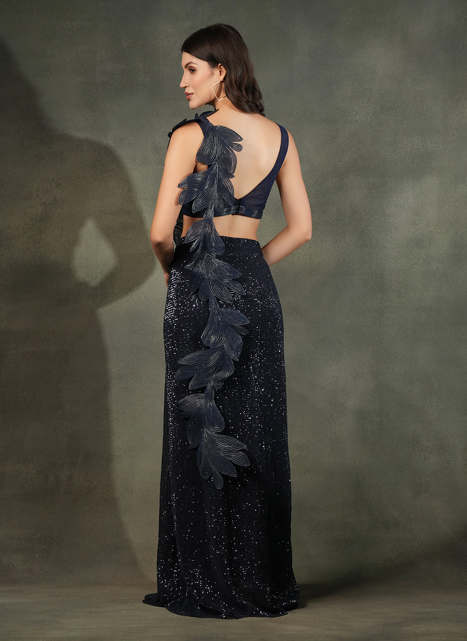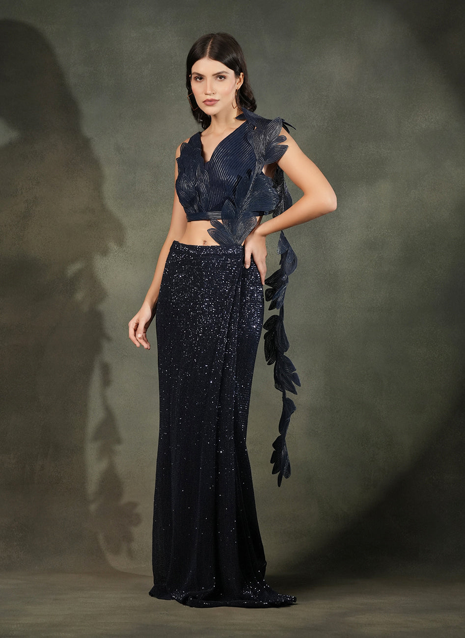 This ultra-glamorous deep blue drape features a fully sequinned mesh saree, paired with detailed layers of 3D appliqué leaf motifs in tonal embroidery