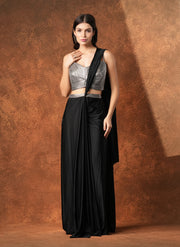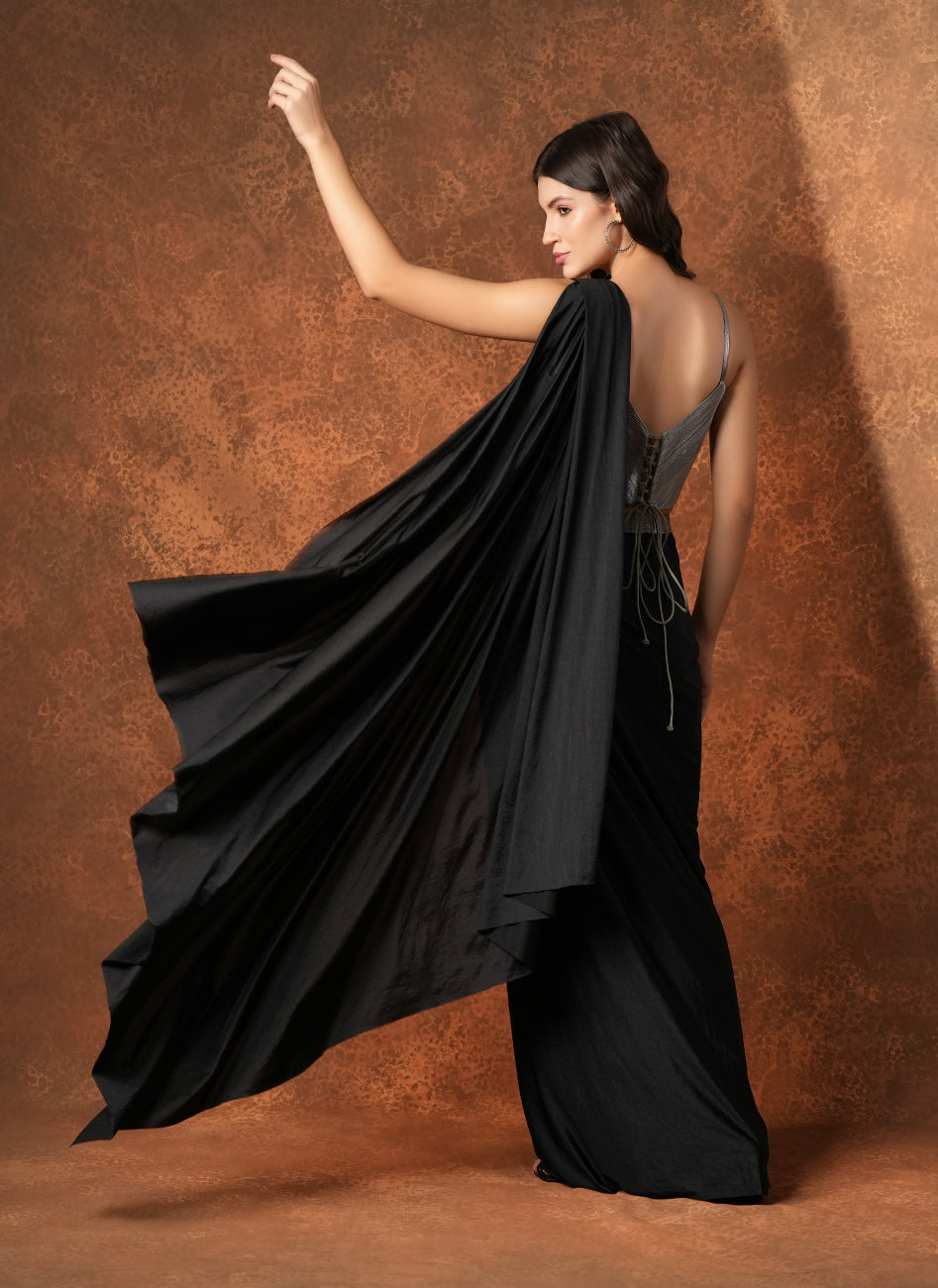 This chic fusion draped saree features a metallic finish silver dori-work bustier with noodle straps paired with a black satin pre-draped saree