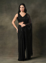 This is an equisite black pre-draped saree with beautifully adorned hand embroidery and tassels detailed v-neck blouse with saree falling beautifully in fluid pleats