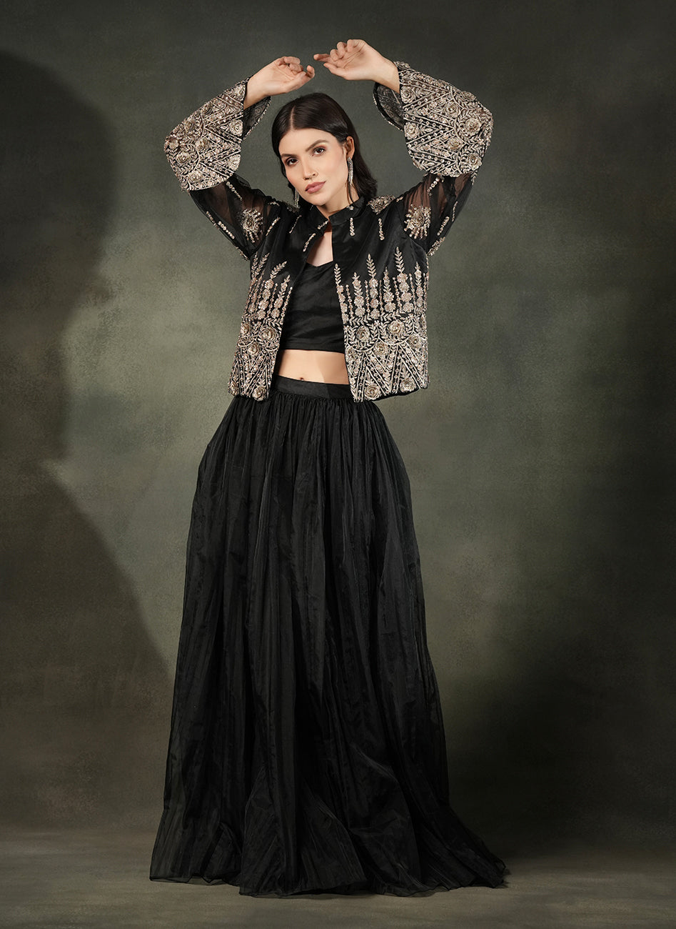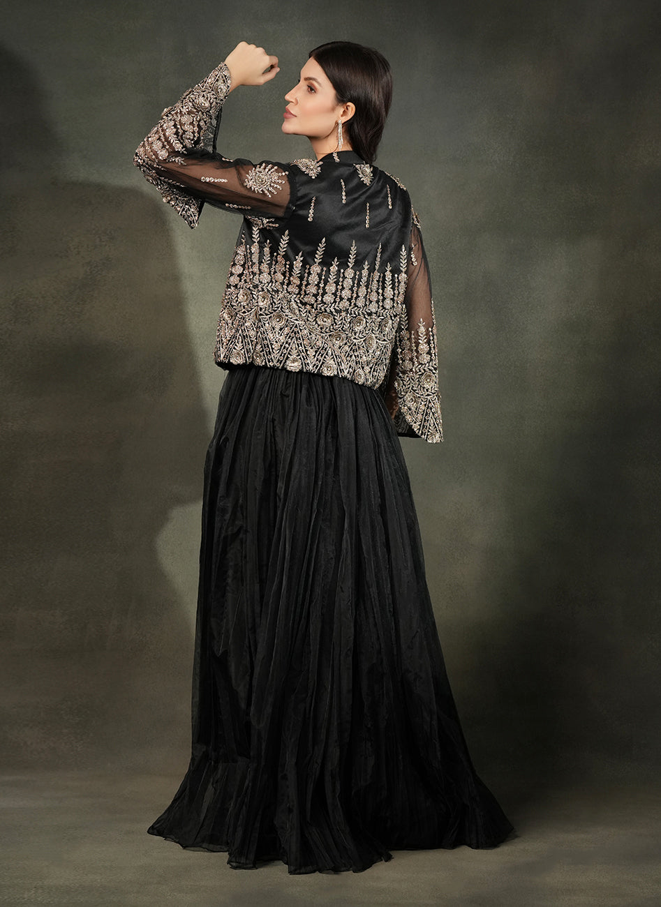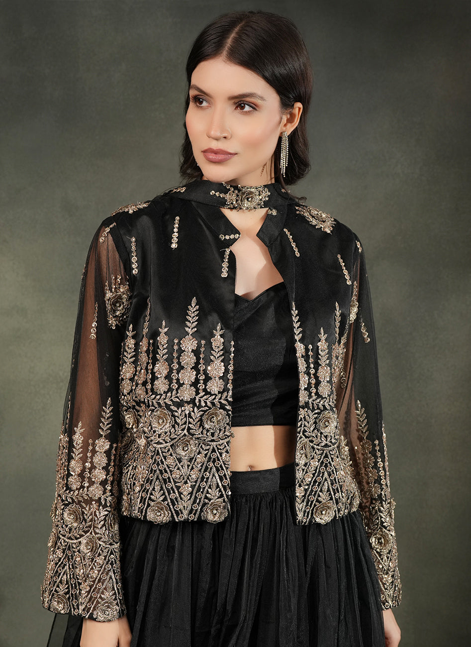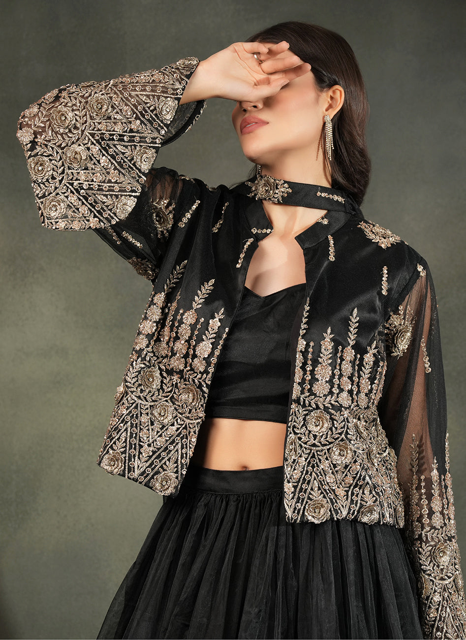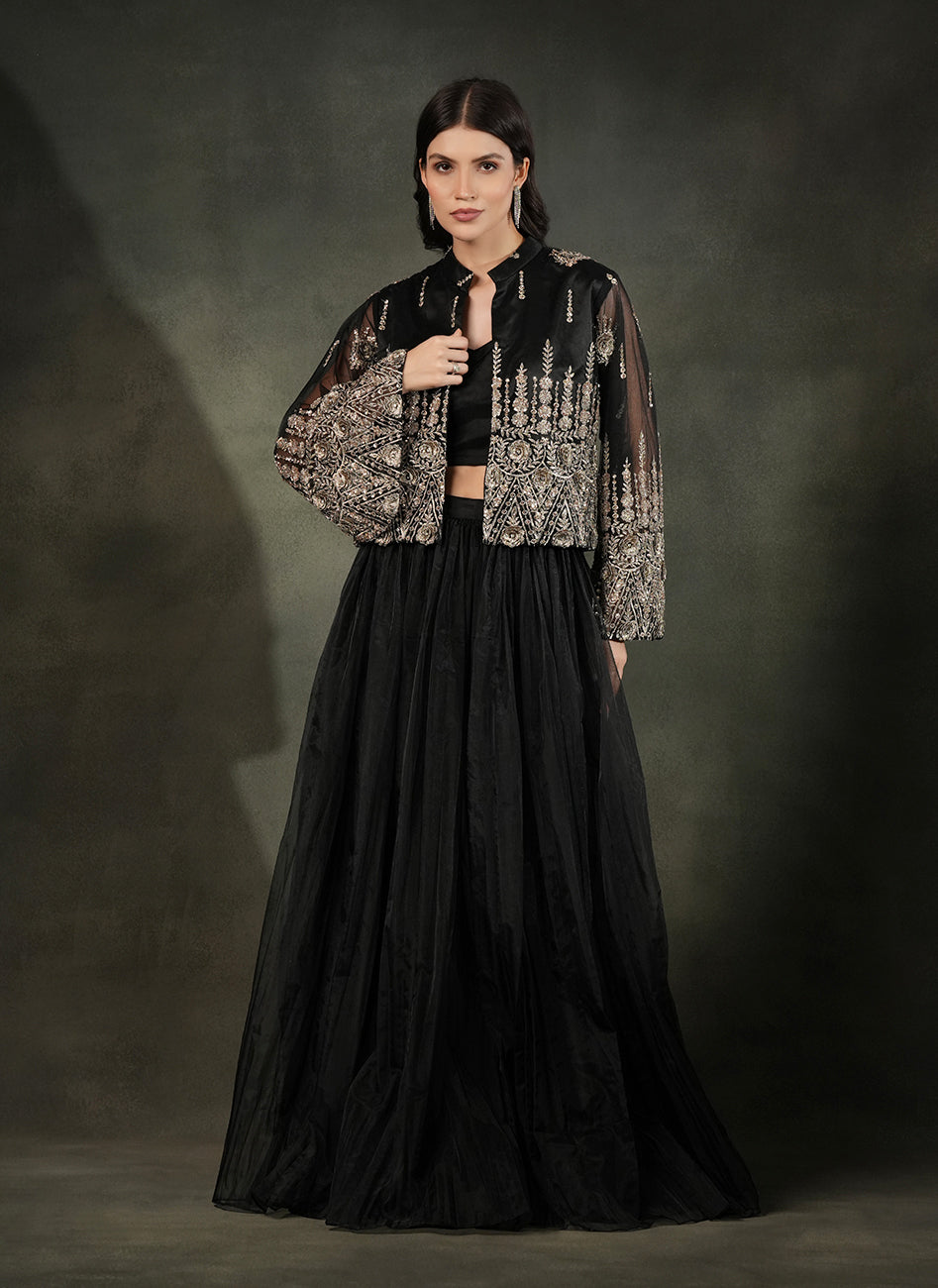 This dramatic all-black Lehengas set features a voluminious tulle lehnga in soft organza paired with a sleek bustier blouse, elevated with a stunning sheer embroided net jacket with delicate metallic threadwork