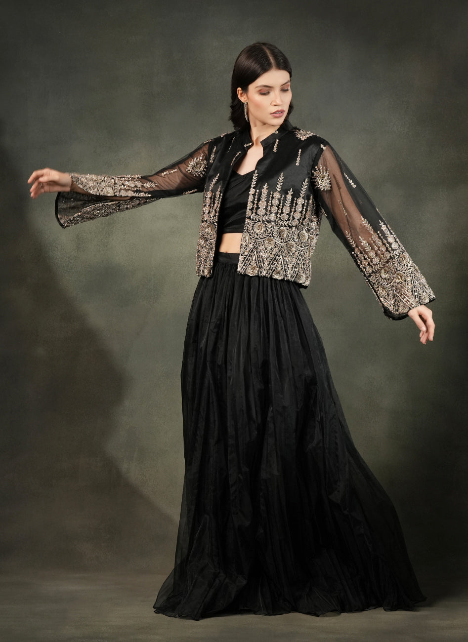 This dramatic all-black lehnga set features a voluminious tulle lehnga in soft organza paired with a sleek bustier blouse, elevated with a stunning sheer embroided net jacket with delicate metallic threadwork