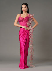 This ultra-glamorous pink drape set features a rich flowing fabric and sculpted layered cord detailing blousel paired with detailed layers of 3D appliqué leaf motifs in tonal embroidery.